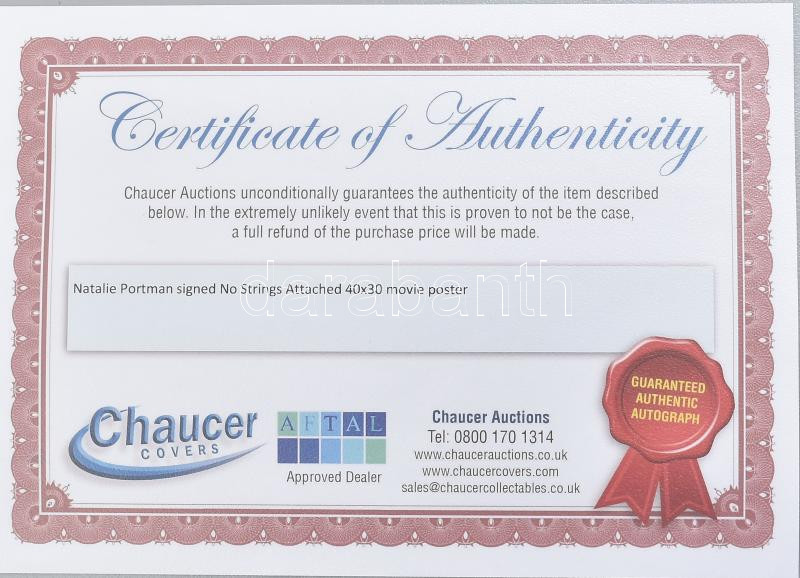 Leírás: Natalie Portman színésznő autográf aláírása film poszterén, tanúsítvánnyal, 75x100 cm, henger formájú kartontokban / Natalie Portman autograph signature on poster