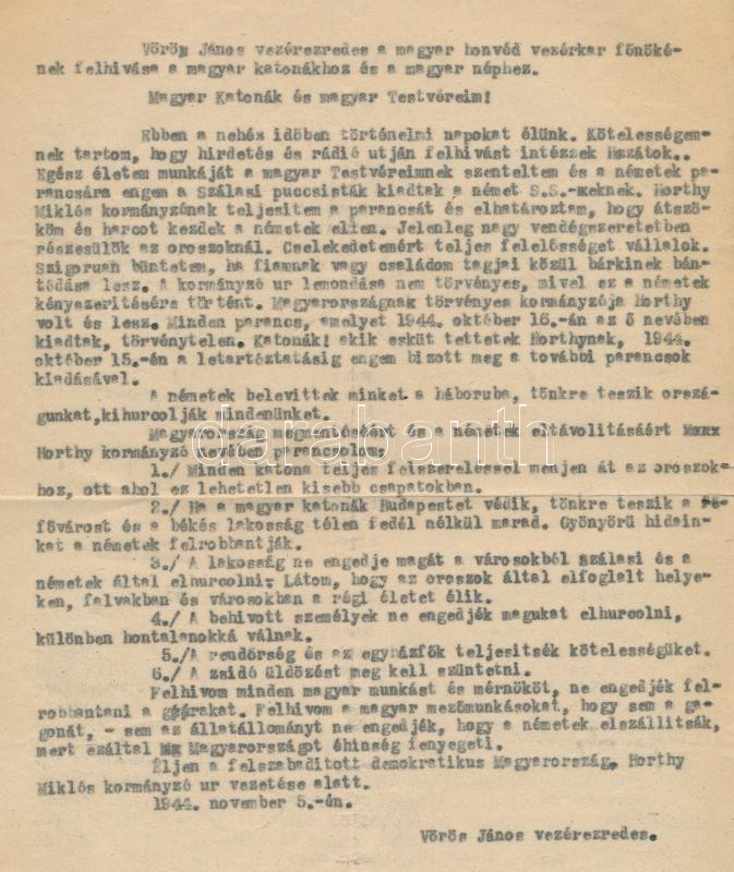 Leírás: 1944 Vörös János vezérezredes felhívása a magyar néphez a németeknek és Szálasiéknak való ellenszegülésre és Horthy melletti kiállásra