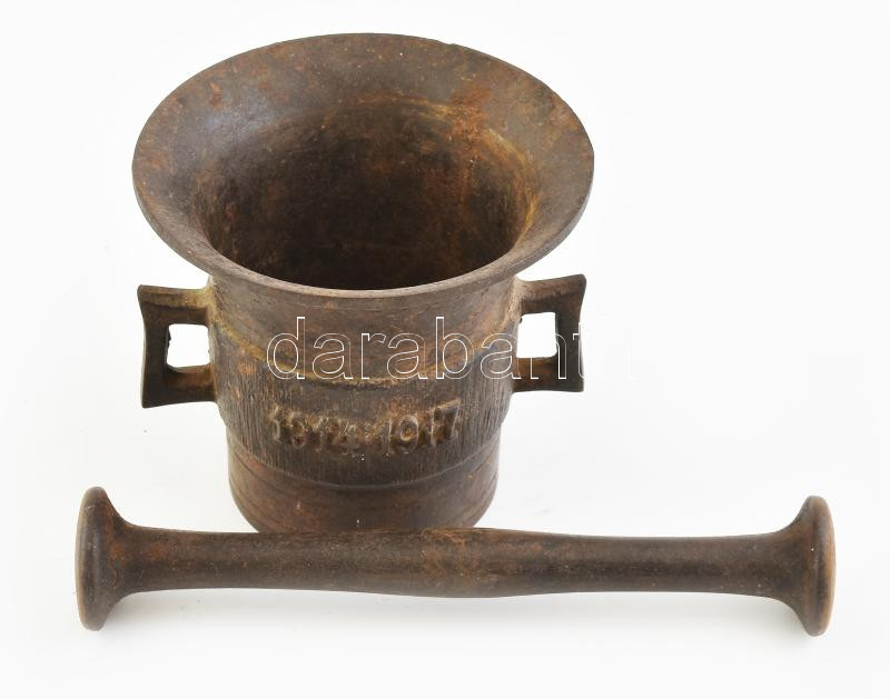 I. világháborús hadi mozsár törővel, "Durch Krieg zum Sieg 1914-1917" felirattal. Öntöttvas, kissé rozsdás, d: 12,5 cm, m: 12 cm, h: 21 cm / WWI military mortar with German inscription, cast iron, slightly rusted