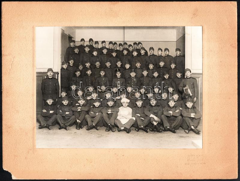 Leírás: cca 1930-1940 Katonai csoportkép szakáccsal, kartonra kasírozott, pecséttel jelzett fotó Borsay budapesti műterméből, a karton sérült, 23x17 cm