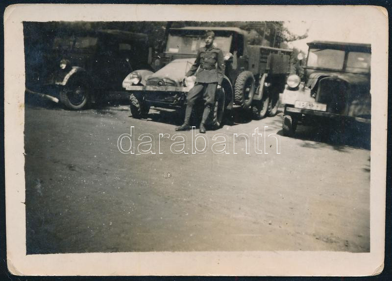 cca 1940 Katona Krupp Protze német tüzérségi vontató teherautó előtt, II. világháborús fotó, 9x6 cm / Soldier in front of Krupp Protze German truck, artillery tractor, WWII photo