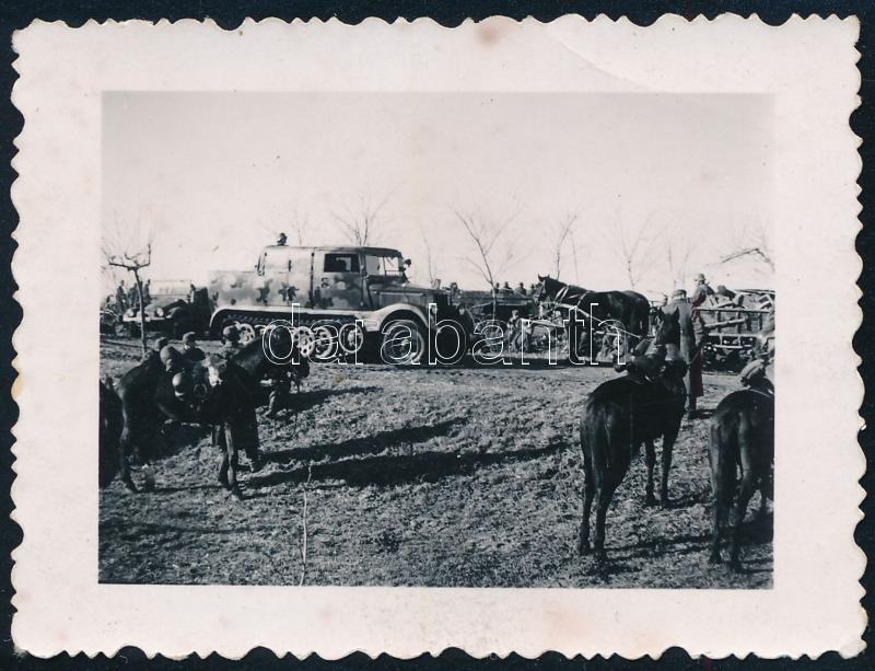 cca 1942 A M. Kir. Honvédség Sd.Kfz. 7 típusú féllánctalpas járműve, II. világháborús fotó, 7x5 cm / Sd.Kfz. 7 half-track vehicle of the Hungarian Army, WWII photo