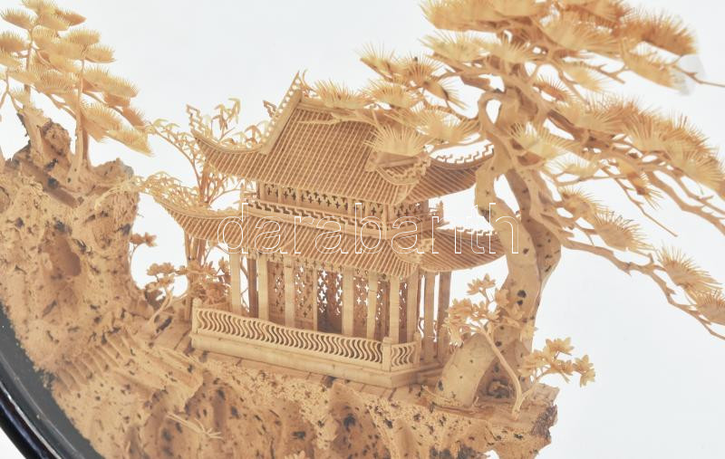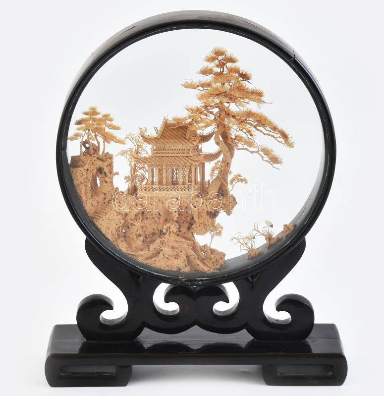 Leírás: Kínai finom fafaragás üvegezett keretben. 30 cm
