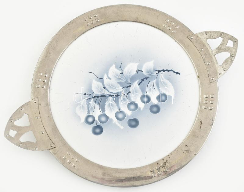 Leírás: Szecessziós, fajanszbetétes tálca, fém peremmel, kopott, d: 44 cm
