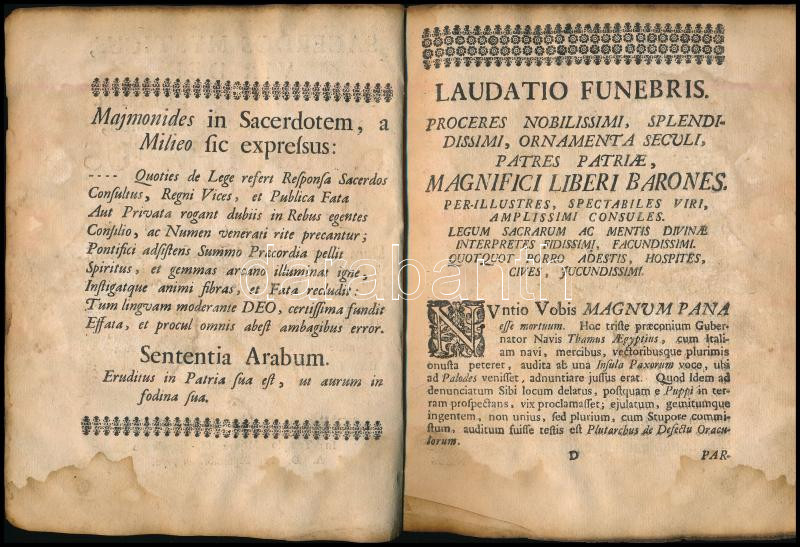 1742 [Huszti György (1710-1767)] Georgio Huszti: Sacerdos mysticus, vir Dei summe reverendus, clarissimus, atque celeberrimus, D. Matthaeus Intze Batzoni, dum viveret, in Ecclesia Reform. Szigetensi V. D. Minister multo Dexterrimus, inde in ill. Collegio Reform. Claudiopolitano primum Philosophiae ac Philologiae S. Mox et S. S. Theologiae Professor Ordin ac cum maxime Rector; denique Florentissimae Ecclesiae Reform. Claudiopolitanae Pastor Primarius, insumul Curator, Pietate, Prudentiae ac Moderamine in Rem Omem Sacram Conspicuus; Ex terris in caelum evocatus; collaudatus a Georgio Huszti in Templo Majore Claudiopolitano A. D. 22. Septembr. 1742. Claudiopolitano, 1742, [Szathmári pap ny.], latin nyelven, foltos lapokkal, 19 sztl. lev. Baczoni Ince Máté (1679-1742) erdélyi református lelkész halála alkalmából előadott gyászbeszéd.
