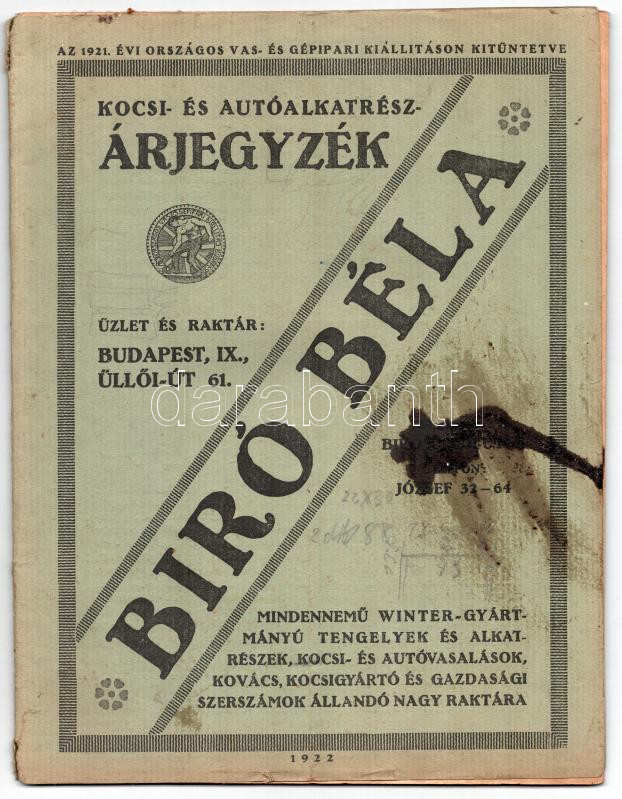 1922 Bíró Béla kocsi- és autóalkatrész árjegyzék, foltos, szakadással,... https://www.darabanth.com/hu/433-Gyorsarveres/433.0/Mutargy-papirregiseg-egyeb/Nyomtatvanyok~1000003/1922-Biro-Bela-kocsi-es-autoalkatresz-arjegyzek-foltos-szakadassal-72p~II2790832