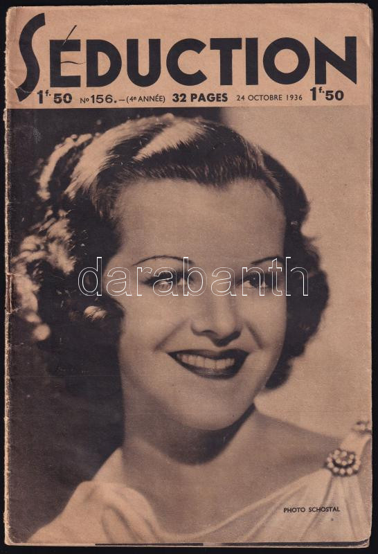 Leírás: 1936 Séduction francia nyelvű erotikus magazin 1 száma, 1936 okt. 24., fekete-fehér képanyaggal gazdagon illusztrált, szakadt borítóval.