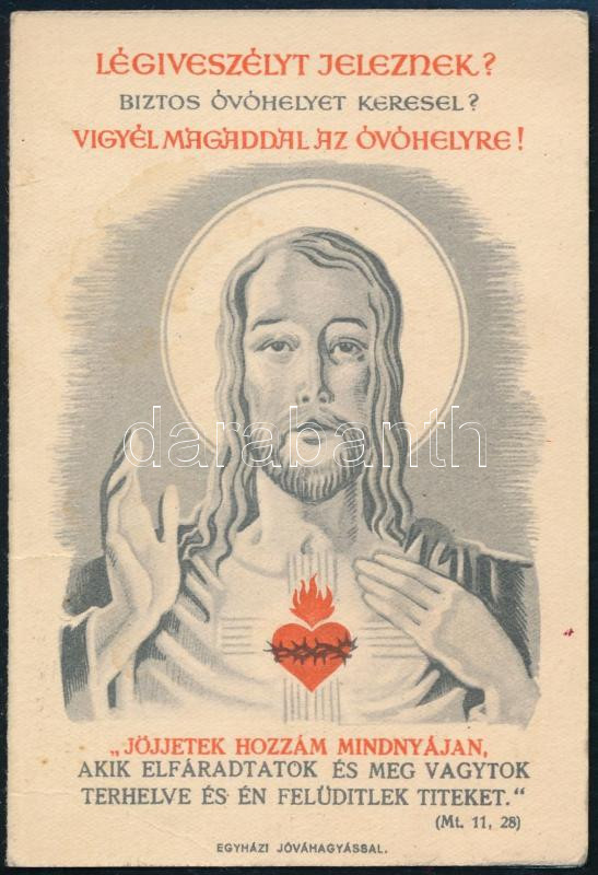 Leírás: cca 1944-1945 "Légiveszélyt jeleznek? ... Vigyél magaddal az óvóhelyre!", II. világháborús vallási röplap, szentkép, Bp., Klösz-ny., 12x8 cm