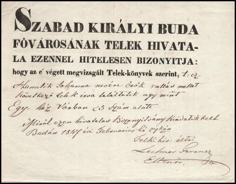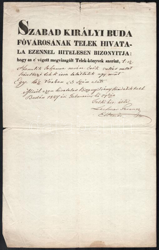 1847 Budai vár ház telekkönyvi bizonyítványa https://www.darabanth.com/hu/433-Gyorsarveres/433.0/Mutargy-papirregiseg-egyeb/Okmanyok~500019/1847-Budai-var-haz-telekkonyvi-bizonyitvanya~II2801765
