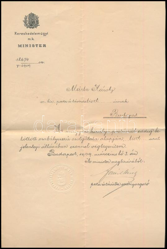 Leírás: 1909 Bp., kereskedelemügyi miniszter fejléces levélpapírjára írt munkaügyi levél, posta- és távírda igazgató aláírásával