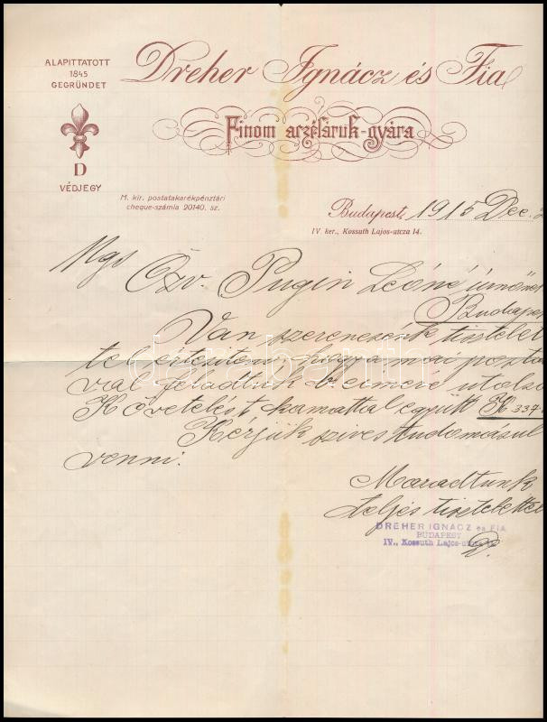 1915 Dreher Ignác és Fia fejléces acéláruk gyára fejléces levélpapírjá... https://www.darabanth.com/hu/433-Gyorsarveres/433.0/Mutargy-papirregiseg-egyeb/Okmanyok~500019/1915-Dreher-Ignac-es-Fia-fejleces-acelaruk-gyara-fejleces-levelpapirjara-irt-level~II2793506