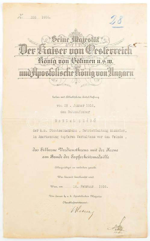 1916 Bécs, "Koronás Ezüst Érdemkereszt a Vitézségi Érem szalagján" kitüntetés adományozásáról szóló oklevél, Szabó Dániel vasúti felügyelő, a M. Kir. Államvasutak (MÁV) miskolci igazgatóságának alkalmazottja részére; német nyelven, aláírással, szárazpecséttel, középen hajtott