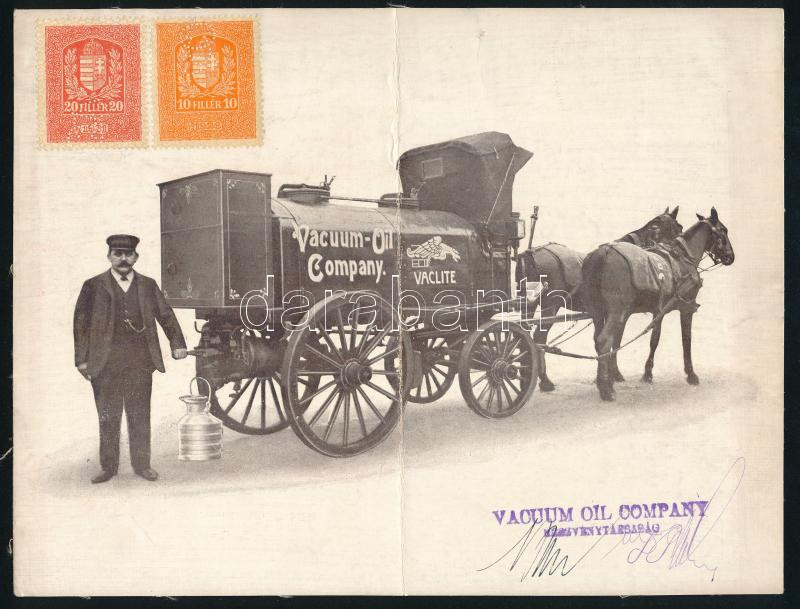 cca 1930 Vacuum Oil Company Rt. vállalati lovaskocsiját ábrázoló illusztráció, vászonra nyomva, aláírásokkal és bélyegzővel, illetékbélyegekkel (számla v. beszerzőlap része lehetett)