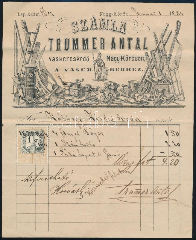 1884 Trummer Antal vaskereskedő Nagykőrös grafikus számla https://www.darabanth.com/hu/433-Gyorsarveres/433.0/Mutargy-papirregiseg-egyeb/Reklam~500023/1884-Trummer-Antal-vaskereskedo-Nagykoros-grafikus-szamla~II2800277