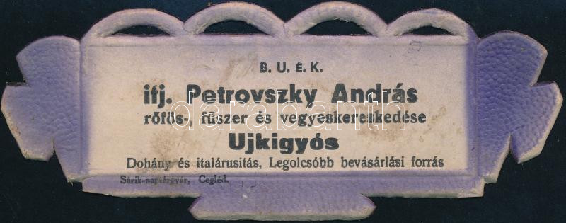 Leírás: 1930 Petrovszky András rőfös fűszer és vegyeskereskedés Újkígyós kisméretű karton reklámtábla újévi Üdvözlettel 6x