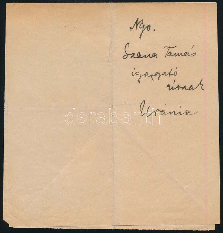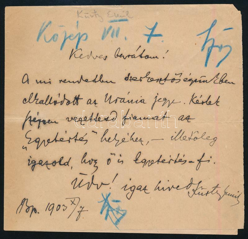 1903 Kürthy Emil (1848-) földbirtokos, író, szerkesztő, újságíró autográf levele Szana Tamás (1844-1908) a Petőfi Társaság főtitkára, az Uránia tudományos színház igazgatójához, amelyben kéri, hogy a fiát, Kürthy György (1882-1972) magyar színészt, későbbi színházigazgatót, az Urániában az Egyetértés szabadkőműves páholy helyére vezesse. Egy beírt oldal, Kürthy Emil autográf aláírásával.