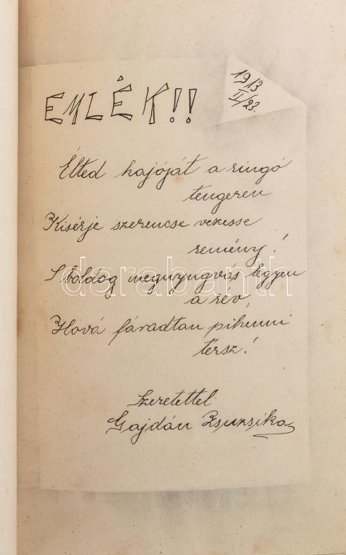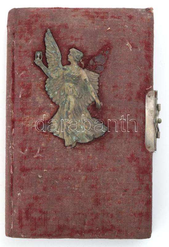 Leírás: 1912-1916 "Emlék - könyv." Kopott bársony-kötésben, díszes címlappal, számos bejegyzéssel, a borítón kopott, sérült díszítéssel.