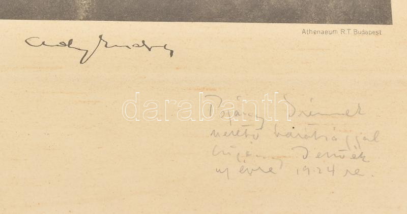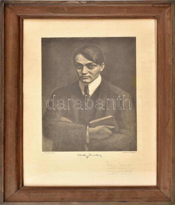 1924 Czigány DezsÅ‘ (1883-1937) festménye után: Ady Endre portréja. Fénynyomat, papÃr, jelzett a nyomat alatt nyomtatva: Pinx. Czigány 1908 és Athenaeum R.t. Budapest. Ady Endre nyomtatott aláÃrásával. Lap alján Czigány Dezsőék autográf ajándékozási soraival 1924-bÅ‘l. 35×26 cm. Üvegezett fakeretben.