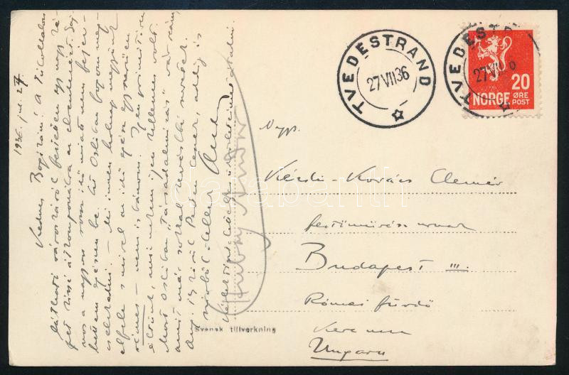 1936 Hubay-Cebrián Andor (1898-1971) festő, a Nemzeti Szalon igazgatója autográf sorai és aláírása Kézdi-Kovács Elemér (1898-1976) festőművész részére Norvégiából képeslapon, Hubay-Cebrián Andor autográf aláírásával.