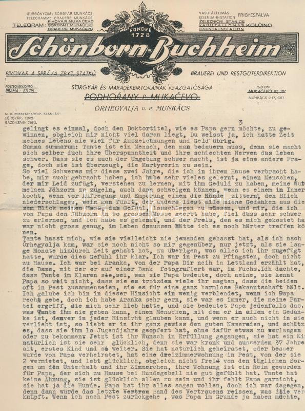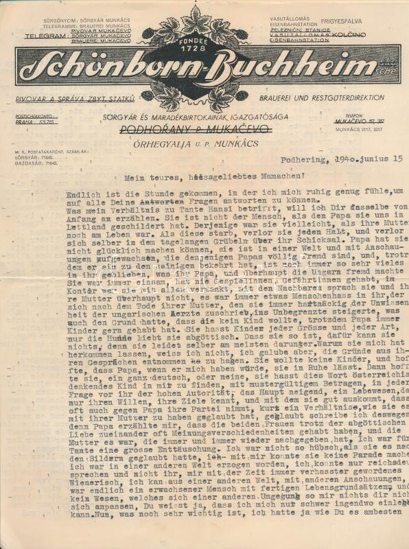Leírás: 1940 Podhering, Őrhegyalja (Munkács, Mukacevo), Schönborn-Buchheim Sörgyár fejléces levélpapírjára írt, német nyelvű gépelt levél, 4 oldalon