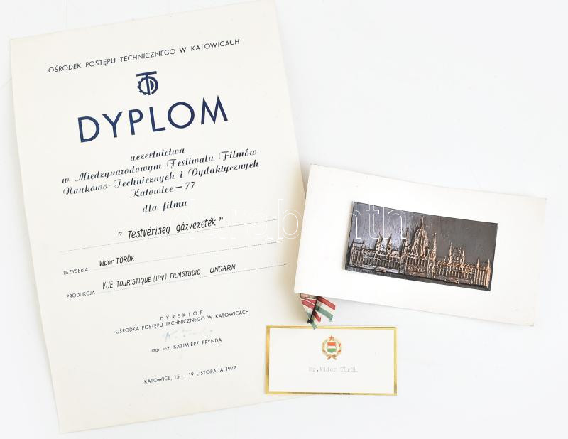 Leírás: 1977 Török Vidor: Testvériség gázvezeték c. filmjének nemzetközi filmfesztivál diplomája, hozzá a fesztivál jelvénye és üdvözlőlap