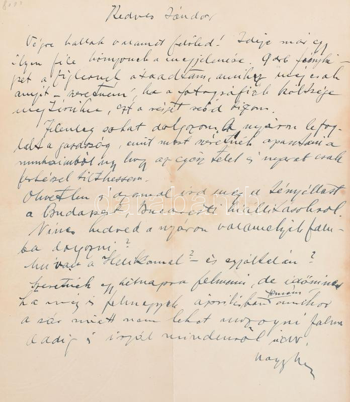 cca 1935 (Zsögödi) Nagy Imre (1893-1976) festőművész saját kézzel írt levele Szolnay Sándor (1893-1950) festőművész részére, érdekes tartalommal: Megemlíti Vásárhelyi Zigler Emilt, akinek fényképeket küldött, feltehetően az erdélyi képzőművészeket bemutató, az Erdélyi Szépmíves Céh által kiadott "Erdélyi művészek" c. könyvbe. Budapesti és bukaresti kiállításokra is vonatkozó sorokkal, ír a festészetéről ("jelenleg sokat dolgozom") valamint egy rövid kérdést is feltesz: "Mi van a Helikonnal?". Egy kézzel írt oldal, Nagy Imre autográf aláírásával.