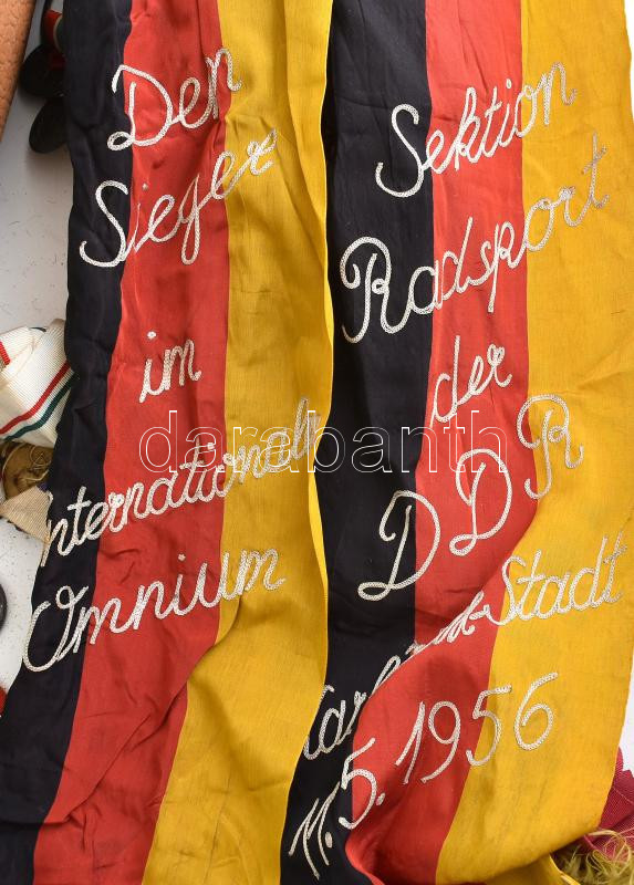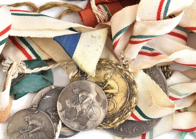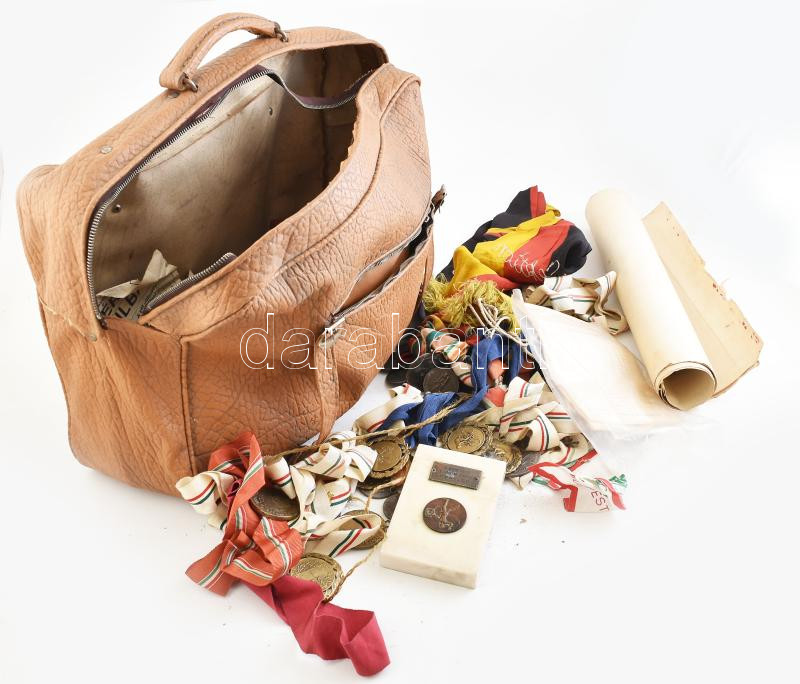cca 1940-1960 Bascsák János (1929-2009) egy sikeres kerékpáros versenyző hagyatéka. Több mint 50 díj. érem, hazai és nemzetközi versenyekről (közöttük a 4000 méteres üldözőverseny főiskolai csapatvilágbajnoki érme), kisebb magyar kluboktól néhány oklevél, zászló és egyéb kapcsolódó tárgy, táskában