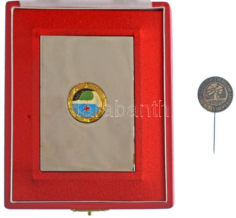 Leírás: ~1975. "A környezet védelméért" aranyozott műgyantás kitüntető jelvény krómozott sárgaréz plakettbe ágyazva eredeti dobozban (86x60mm) + "Környezetvédelem - Hazafias Népfront" ezüstpatinázott bronz jelvény (24mm) T:1 ujjlenyomat
