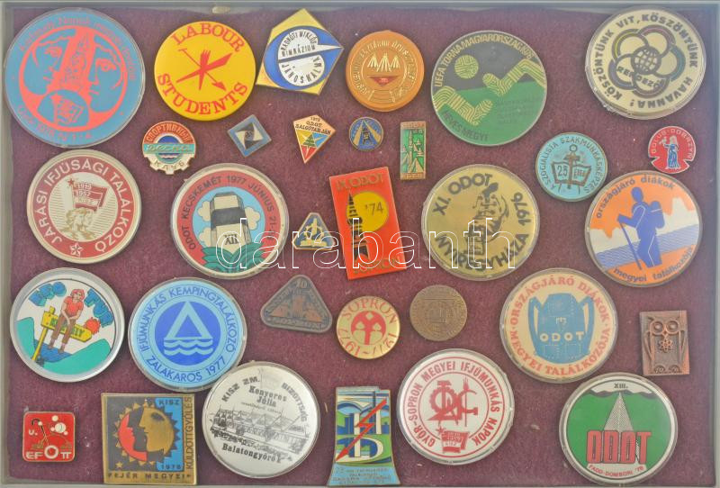 ~30 darabos vegyes jó állapotú magyar és külföldi kitűző tétel, közte műgyantás és zománcozott darabokkal, műanyag tálcán