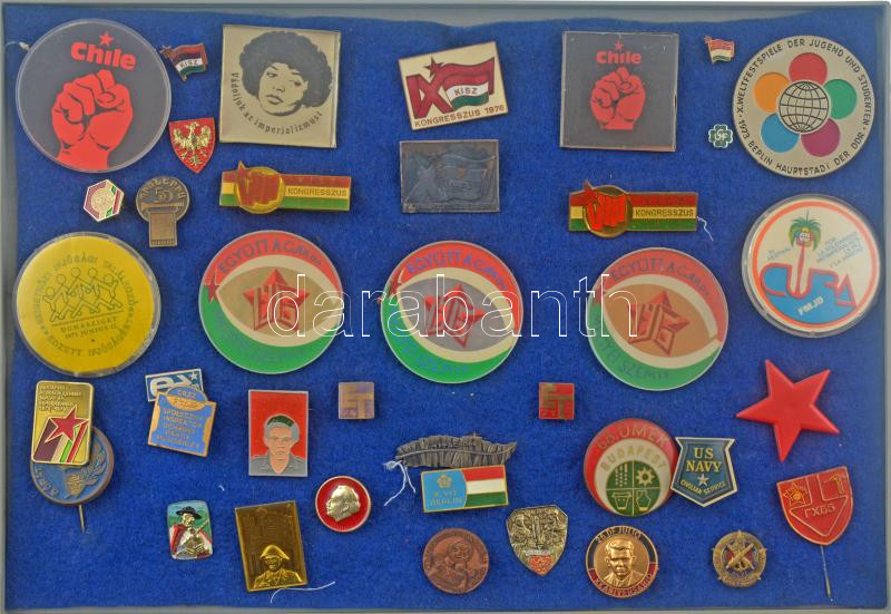 ~35 darabos vegyes jó állapotú magyar és külföldi kitűző tétel, közte műgyantás és zománcozott darabokkal, műanyag tálcán
