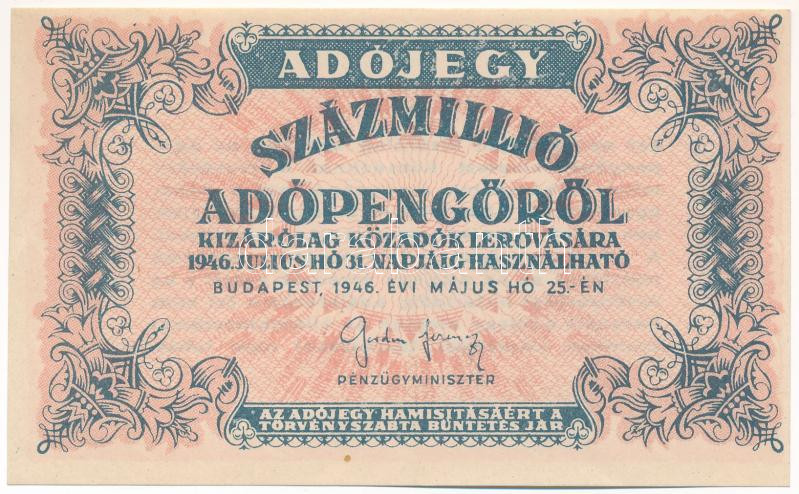 Leírás: 1946. 100.000.000AP kissé felfelé tolódott nyomattal T:I,I- apró fo.