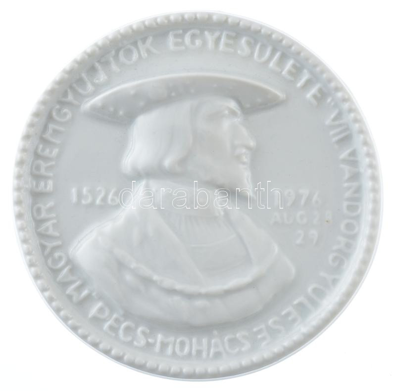 1976. "II. Lajos király - Magyar Éremgyűjtők Egyesülete VII. Vándorgyűlése Pécs - Mohács 1976. Aug. 28-29" jelzetlen Zsolnay porcelán emlékérem, tokkal (90mm) T:1