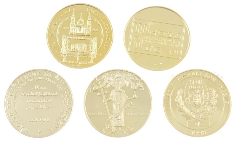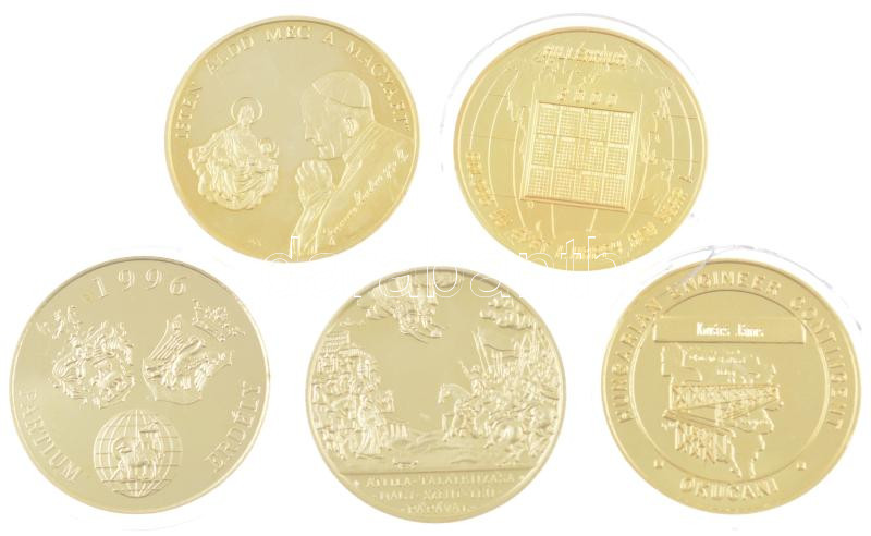 5 darabos aranyozott Cu emlékérem tétel, közte "II. János Pál", "Attila találkozása Nagy Szent Leó pápával", "Magyar Műszaki Kontingens", "Magyar Reformátusok III. Világtalálkozója", "Megal Nemesfémipari Rt." kapszulában T:1- (42mm)