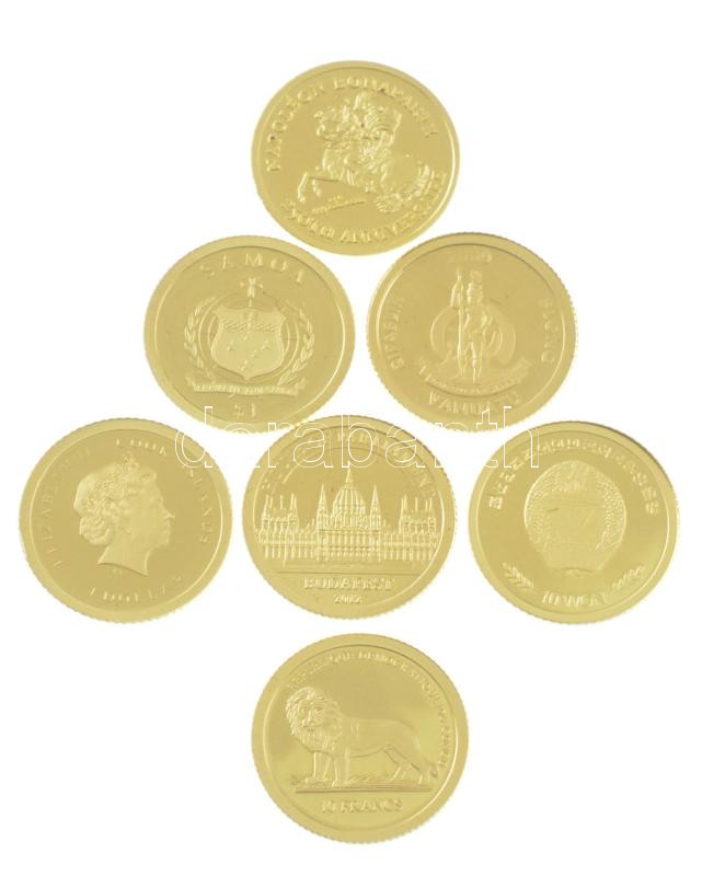 2006-2019. "The Smallest Gold Coins of the World" collection of 7 gold coins in mahogany case from different countries,with Hungarian certificates (0,5g/0,999/11mm) C:PP