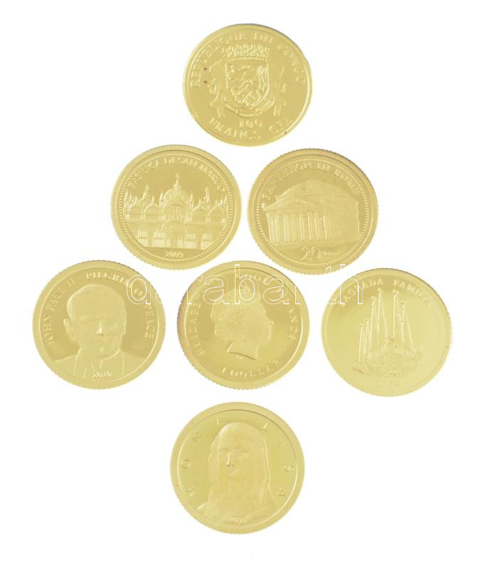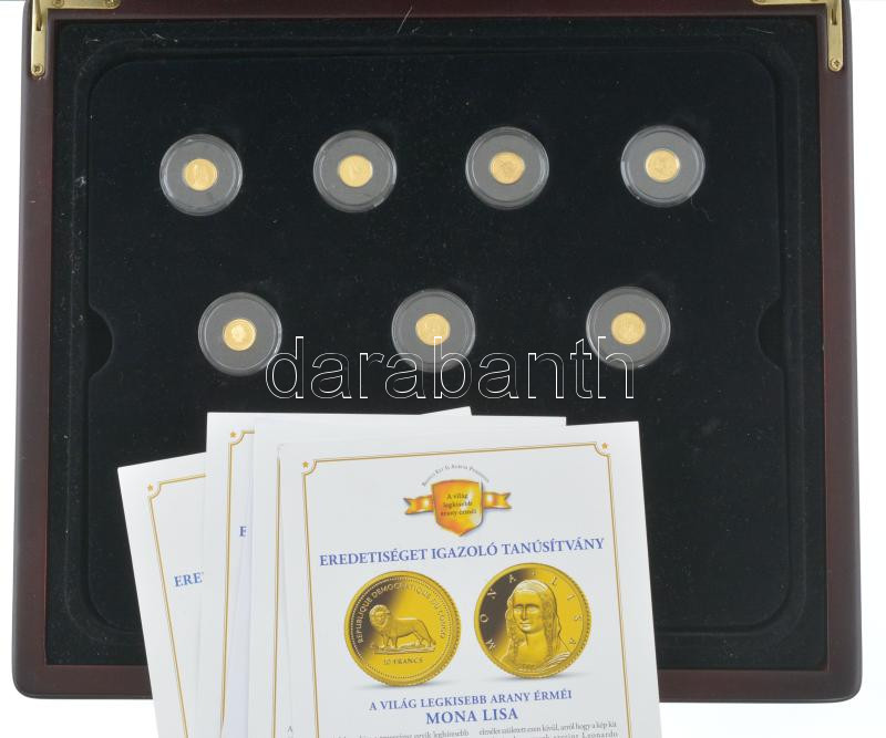 2006-2019. "A világ legkisebb arany érméi" 7db-os aranyérme gyűjteménye klf országok darabjaival, mahagóni fa díszdobozban, magyar nyelvű tanúsítványokkal (0,5g/0,999/11mm) T:PP