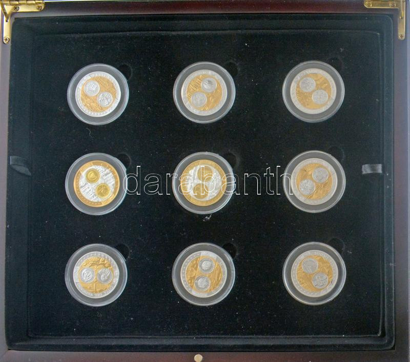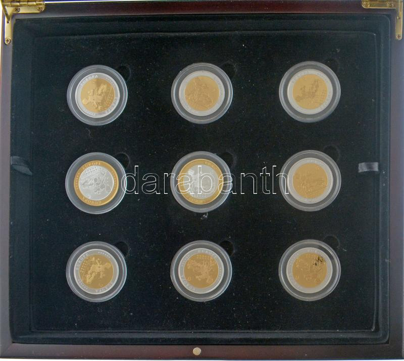DN "Az Európai Unió első közös valutája" 15 darabos aranyozott és ezüstözött Cu emlékérem kapszulában, mahagóni fa éremtartó kazettában, kivehető tálcával (35mm) T.PP
