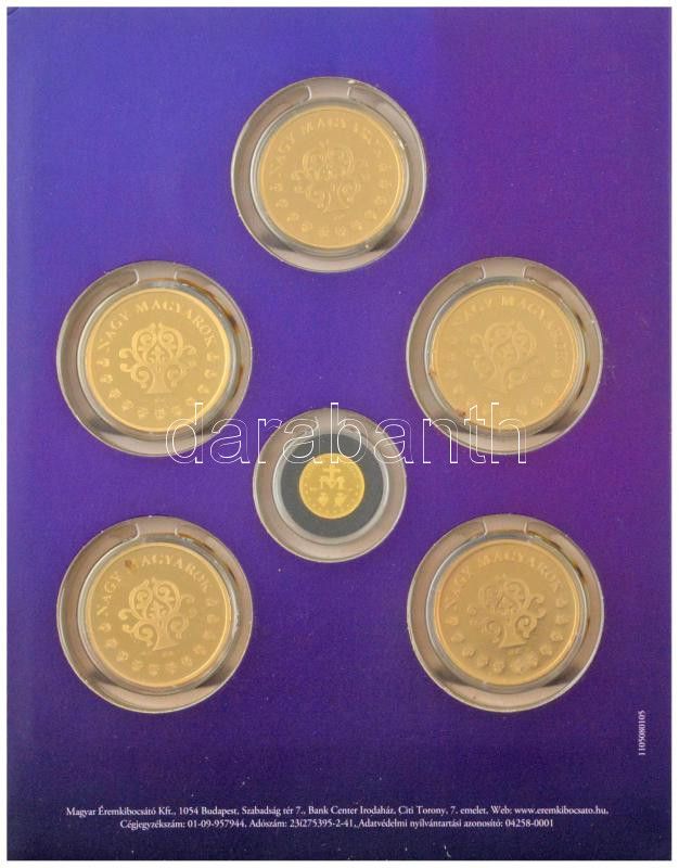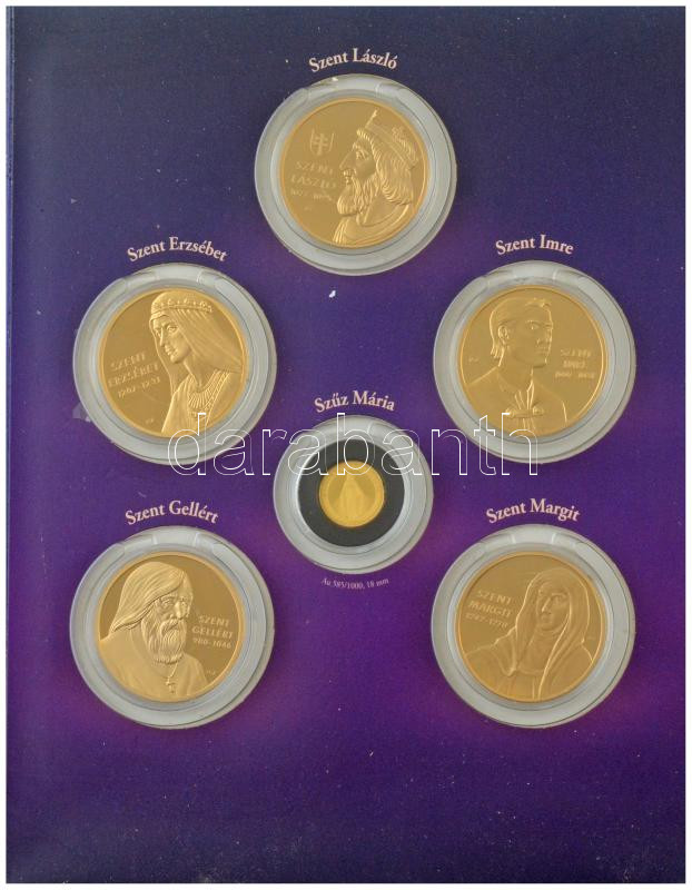 ifj. Szlávics László (1959-) 2020. "Magyar Szentek - akik vigyáznak ránk" 6 darabos emlékérme sorozat, közte 5 darab aranyozott Cu emlékérem (40mm) + illetve "Szűz Mária - A Magyarok Nagyasszonya" Au emlékérem (2g/0,585/18mm) kapszulában, tanúsítványokkal, papír dísztokban T:1