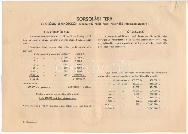 Budapest 1954. "Ötödik Békekölcsön" nyereménykölcsön kötvény... https://www.darabanth.com/hu/433-Gyorsarveres/433.0/Numizmatika/Reszvenyek-es-sorsjegyek~2000017/Budapest-1954-Otodik-Bekekolcson-nyeremenykolcson-kotveny-100Ft-rol-szarazpecsettel~II2797306