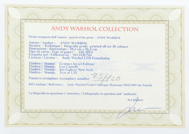 Andy Warhol (1928-1987): Flowers. Ofszet litográfia, papír. Sorszámozott: 75/100, jelzett a nyomaton. Georges Israel editeur szárazpecséttel is jelzett, tanúsítvánnyal. 36x36 cm / Lithography with attest