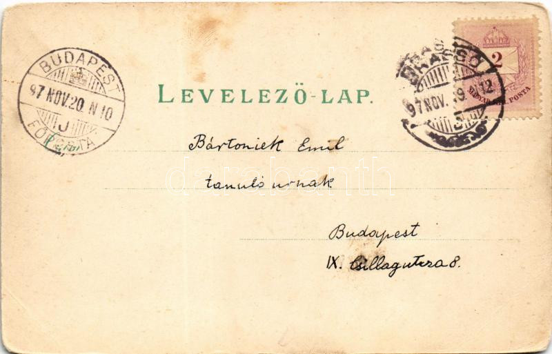 1897 (Vorläufer) Brassó, Kronstadt, Brasov; Evang. Kirche, Rathaus, Marktplatz, Schlossberg, Graft. Verlag W. Hiemesch / Evangélikus templom, Városháza, Piactér, Fellegvár villasor, Graft-patak / church, city hall, market square, villas, river. Kunstanstalt Rosenblatt Art Nouveau, floral, litho (EB)