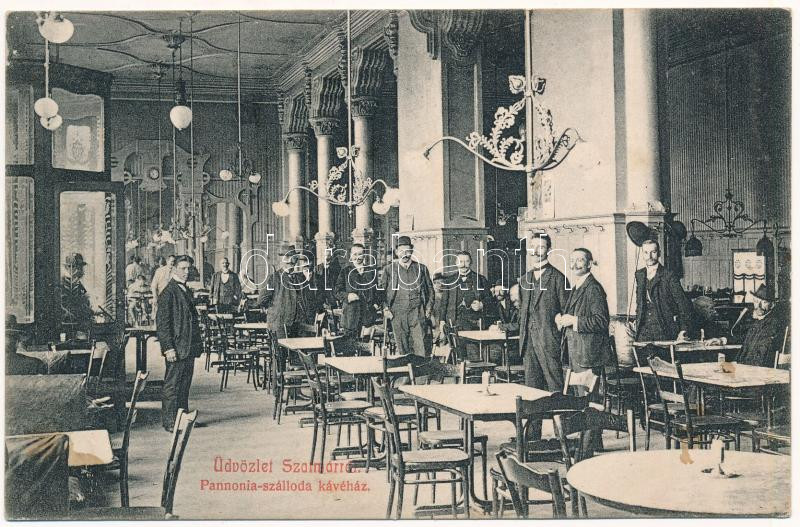 1915 Szatmárnémeti, Szatmár, Satu Mare; Pannonia szálloda és kávéház, belső vendégekkel és pincérekkel. Cseplák Bálint kiadása. Tóth S. Imre fényképész felvétele / hotel and café, interior with guests and waiters (fl)