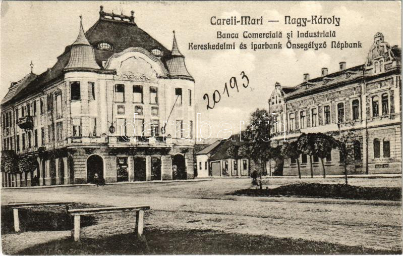 Leírás: Nagykároly, Carei; Banca Comerciala si Industriala / Kereskedelmi és Iparbank Önsegélyző Népbank / bank (Rb)
