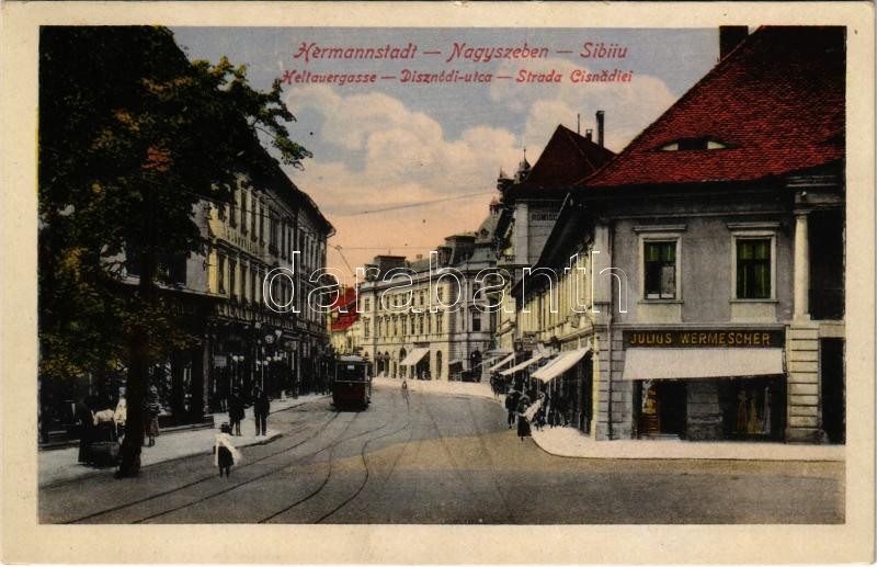 Leírás: Nagyszeben, Hermannstadt, Sibiu; Heltauergasse / Disznódi utca, villamos, Julius Wermescher üzlete. Jos. Drotleff kiadása / Strada Cisnadiei / street view, tram, shops