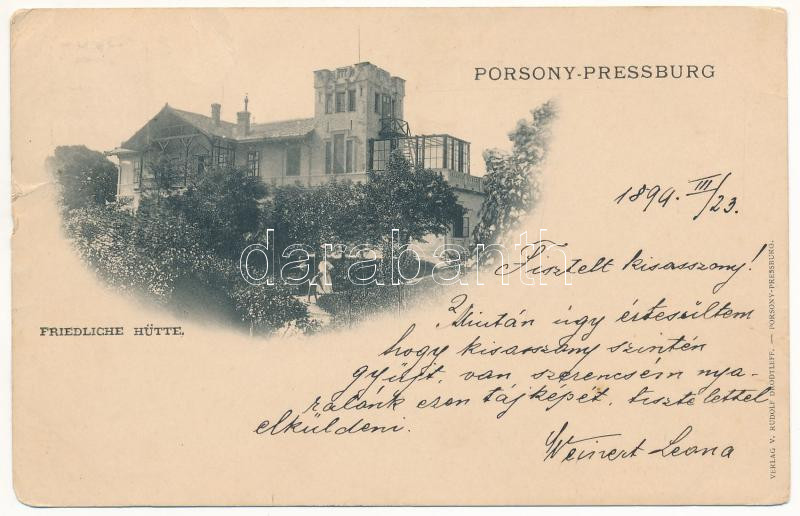 1899 (Vorläufer) Pozsony, Pressburg, Bratislava; Friedliche Hütte / ny... https://www.darabanth.com/hu/434-Gyorsarveres/434.0/Kepeslapok/Felvidek~2000006/1899-Vorlaufer-Pozsony-Pressburg-Bratislava-Friedliche-Hutte-nyaralo-Rudolf-Drodtleff-kia~II2806497