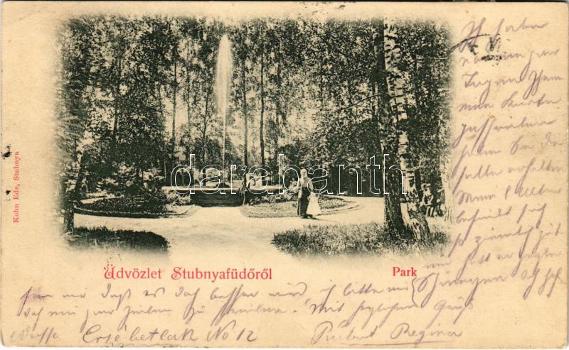 Leírás: 1901 Stubnyafürdő, Túróchévíz, Stubnianske Teplice, Turcianske Teplice; Park, szökőkút. Kohn Ede kiadása / spa, park, fountain (EK)