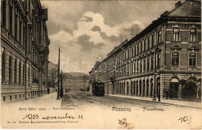 1903 Pozsony, Pressburg, Bratislava; Baross Gábor utca, villamos. Gelb... https://www.darabanth.com/hu/434-Gyorsarveres/434.0/Kepeslapok/Felvidek~2000006/1903-Pozsony-Pressburg-Bratislava-Baross-Gabor-utca-villamos-Gelbers-Anischtskartenausstellung~II2809247