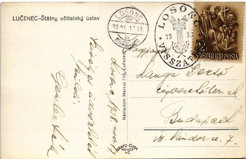 Leírás: 1938 Losonc, Lucenec; Státny ucitelsky ústav / Állami tanárképző / teachers' training institute + "1938 Losonc visszatért" So. Stpl.