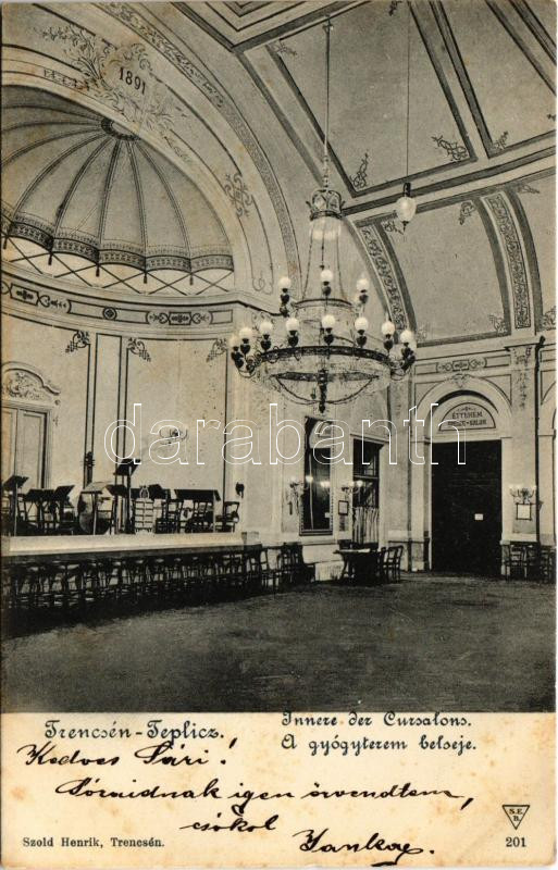 Leírás: Trencsénteplic, Trencianske Teplice; Innere der Cursalons / A gyógyterem belseje, étterem. Szold Henrik kiadása / spa, restaurant, interior (fl)