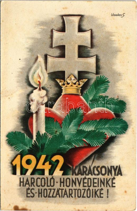 Leírás: 1942 Karácsonya Harcoló honvédeinké és hozzátartozóiké, Leventeifjúság honvédkarácsonya. Tábori Postai Levelezőlap / WWII Hungarian military field postcard with Christmas greeting s: Légrády S. (gyűrődések / creases)