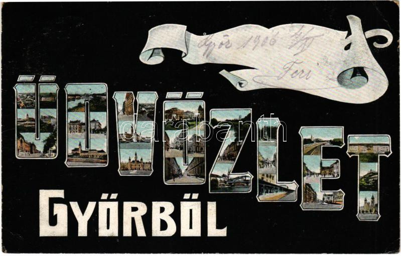 1906 Győr, Üdvözlet. Berecz Viktor kiadása, Art Nouveau montázs (EK) https://www.darabanth.com/hu/434-Gyorsarveres/434.0/Kepeslapok/Magyarorszag~2000004/1906-Gyor-Udvozlet-Berecz-Viktor-kiadasa-Art-Nouveau-montazs-EK~II2802224